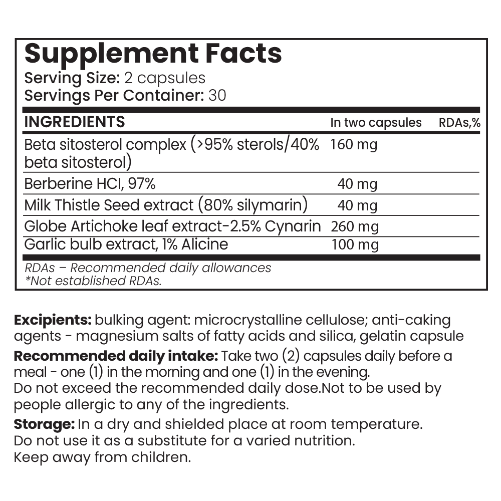 W pełni naturalna, standaryzowana formuła roślinna dostarczająca ukierunkowanych związków roślinnych, które wspierają prawidłowy poziom cholesterolu oraz zdrowie serca i wątroby.